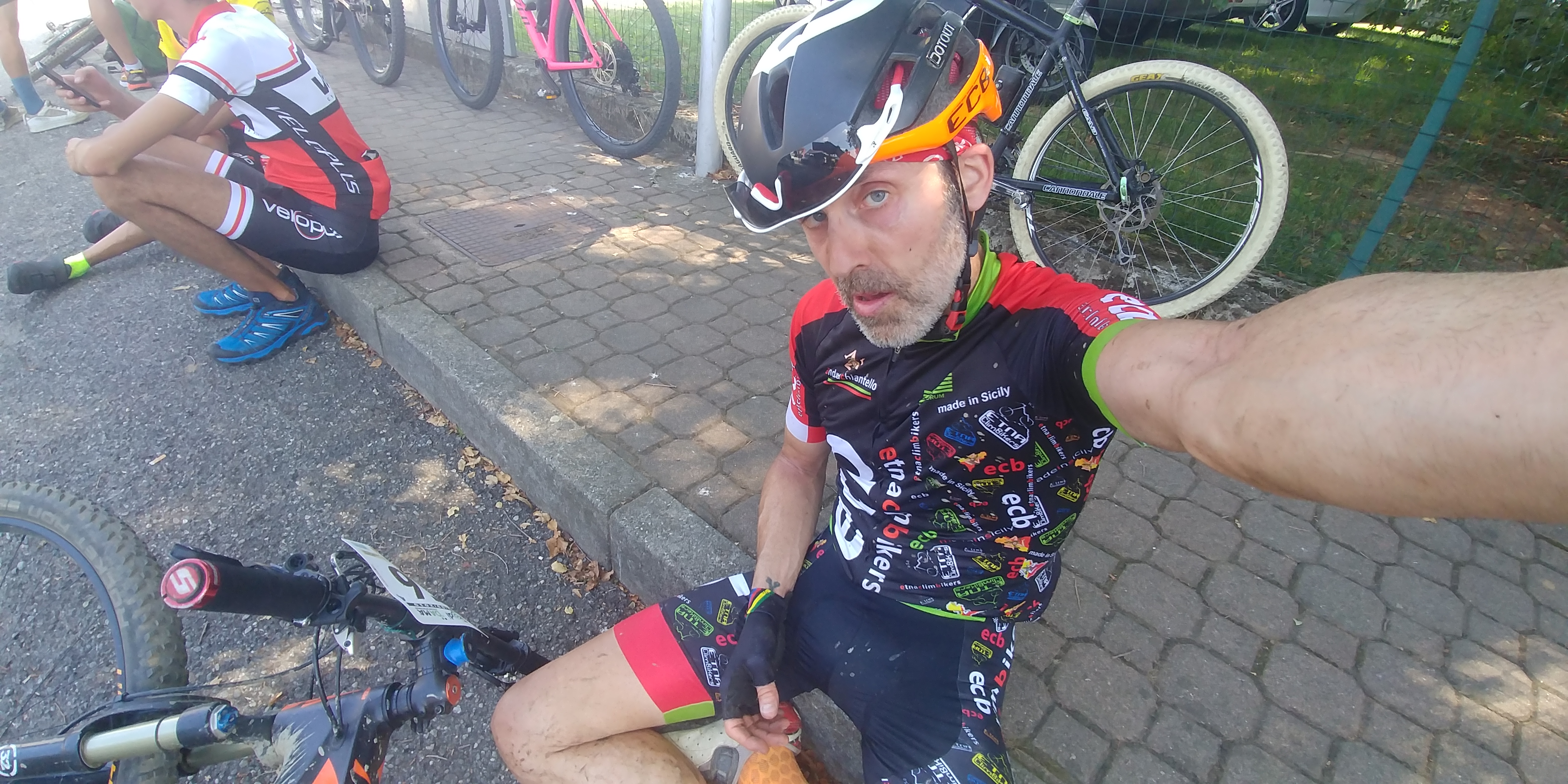 Andrea visibilmente stanco dopo l'arrivo nell'edizione 2019